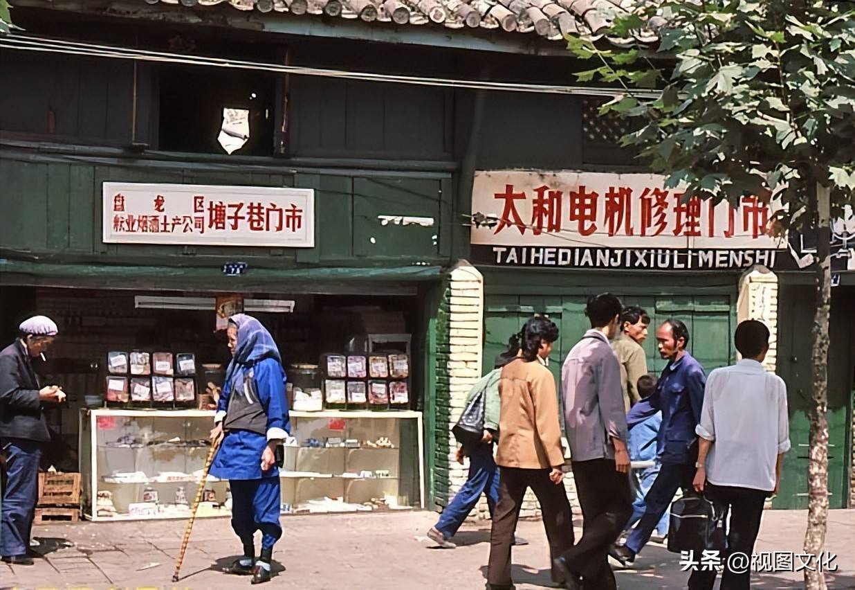 在盘龙区塘子巷,也能感受到那个年代的生活脉动。街上有烟酒土产公司和电机修理门市,热闹而接地气。画面中,两位老太太并肩而行,一人裹着小脚,一人是天足,这一幕仿佛记录下了旧与新的交替。如今的塘子巷已改名为塘双路,但当年的风貌依旧让人印象深刻。