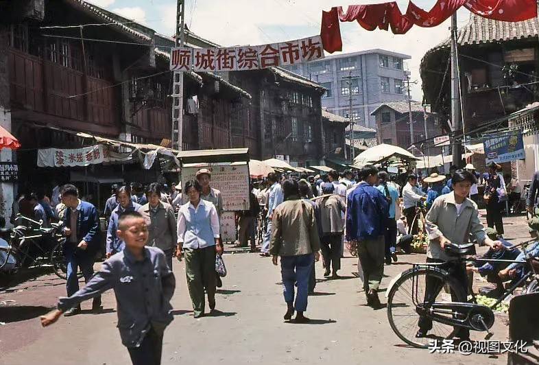 同一年,顺城街综合市场人声鼎沸。顺城街是一条历史悠久的老街,两旁仍是木质结构的老房子,显得古色古香。市场里,小贩的吆喝声与人们的脚步声交织在一起,充满了浓厚的市井气息,勾勒出昆明百姓最真实的日常。