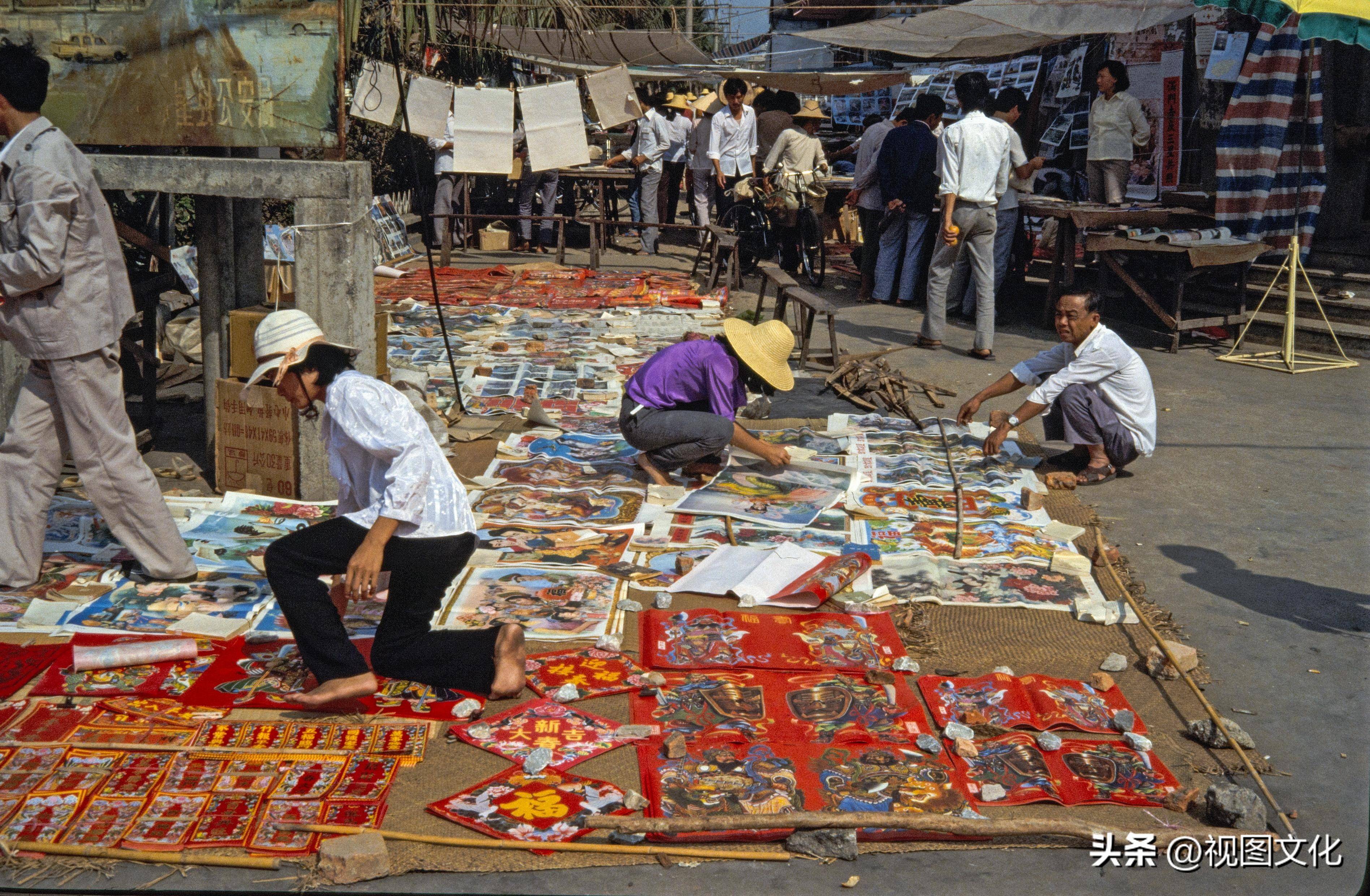 1988年,在石林彝族自治县的集市上,年味渐浓。摊位上摆满了春联和年画,摊主甚至光着脚在摊位间忙碌穿梭。集市一角,还能看到县公安局的宣传栏,映衬出当时乡镇生活的真实图景。