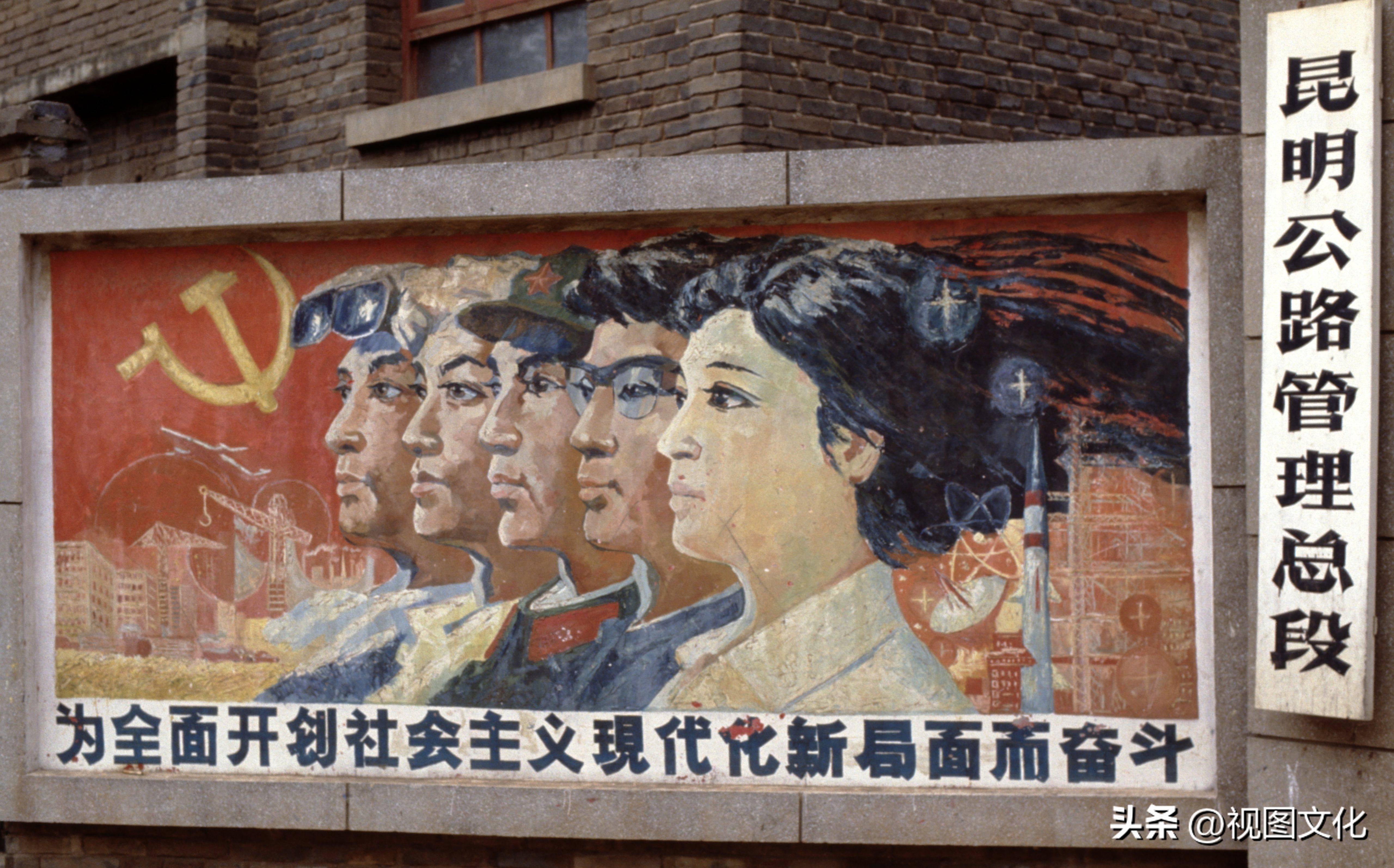 1985年的昆明,官渡区金汁路与关兴路交叉口附近,昆明公路管理总段大门口挂着一幅巨大的时代宣传画。画面上有工人、农民、士兵、科学家和教师的形象,主题是“为全面开创社会主义现代化新局面而奋斗”,充满了那个年代的昂扬精神。