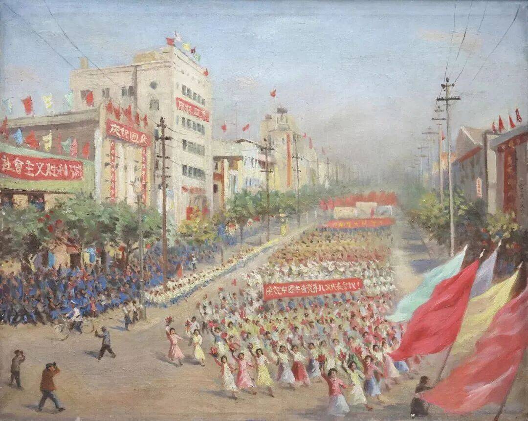 同样在秦宣夫1956年的《国庆》中,我们看到的也是统一着装、整齐划一的方队。人群虽然庞大,但个体特征被弱化,融入到了欢庆的整体氛围中。