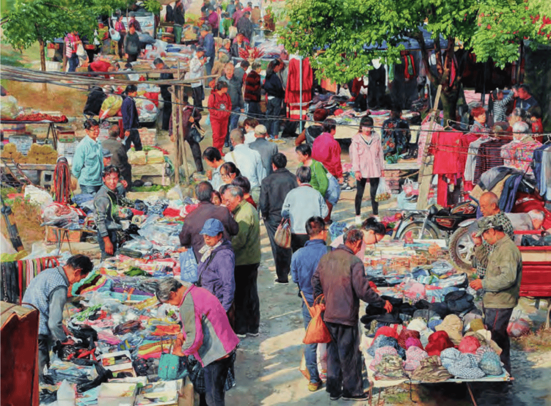 何媛媛在所创作的作品《春社·九》中,通过宽阔的画幅和柔和的色调,以最大限度还原生活的温情之感——讨价还价的路边摊,熙熙攘攘的人群,满满当当的购物袋,浓郁的烟火气扑面而来,呈现出衣食富足的小康生活和乡间集市一派红火热闹的景象。
