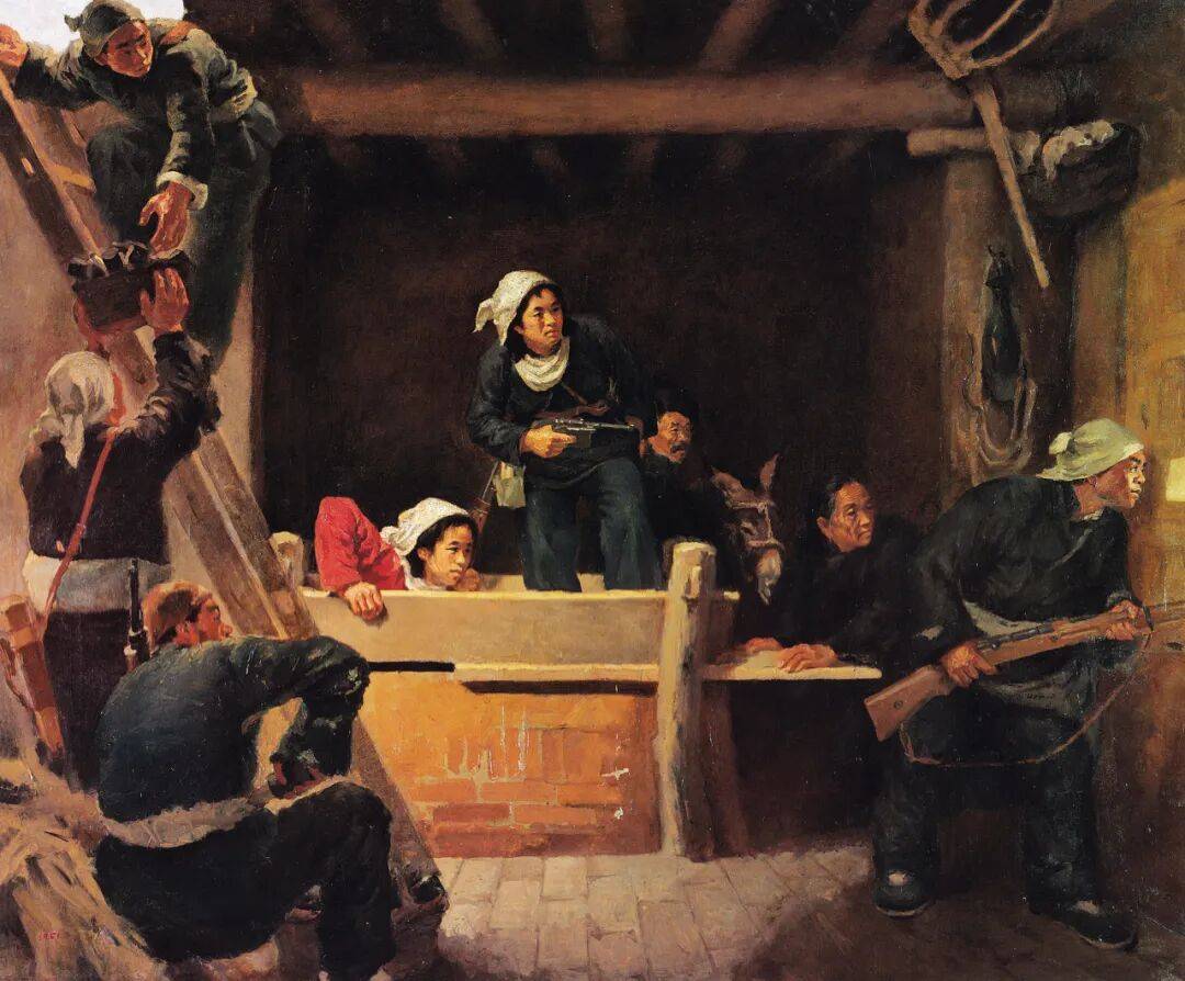 在罗工柳的名画《地道战》中画家选择了准备战斗的瞬间,使静默的场面蕴藏着一种紧张的气氛。画面中刚从地道内探出身体的妇女,往房顶运送武器的青年,向屋外望的拎枪人,都巧妙地拓展了画面的空间,同时也将这特殊的游击战形式表现得十分典型和生动。