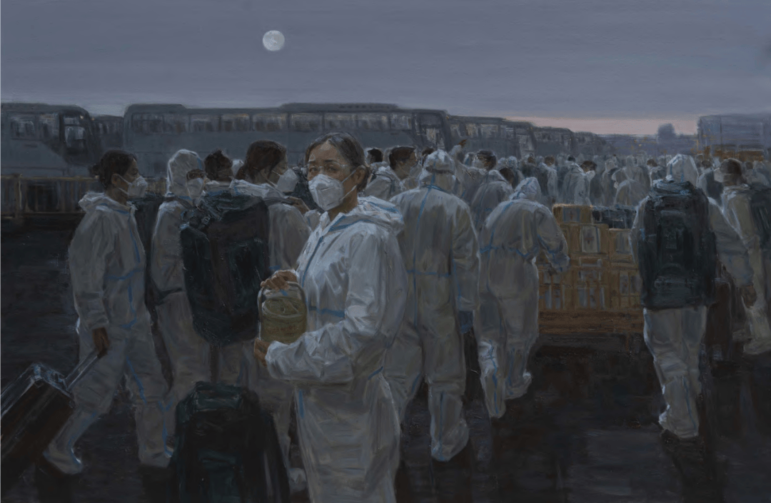 作品《晨光》的环境设定在凌晨医护人员紧急集合出发的瞬间,旨在传递一种肃穆、紧急之感。背着行李、拉着物资的人们,义无反顾的背影形成了他们,作为白衣天使的主旋律。作为画面主人公手捧饭盒的医护人员,她是一位医生、一位妻子,更是一位母亲、一个女儿,但是在疫情之中,她仅仅是一位“无名英雄”。画面记录了她回眸的瞬间,眼神中流露出对家庭的不舍、对前方未知的忐忑,以及身为医护人员职责的果决与坚毅,也是对一线医护人员内心写照的集中体现。