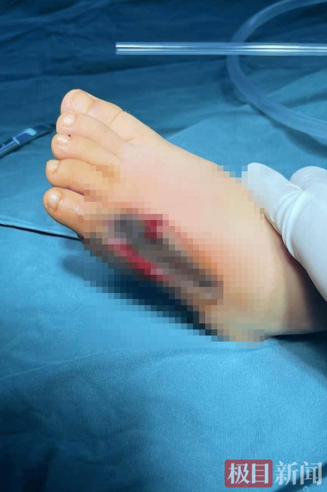 爸爸很快察觉到不对劲,立即下车查看。此时迪迪的左脚已被自行车的轮辐条绞得血肉模糊。爸妈不敢大意,紧急送孩子赶到儿童医院。清创后评估,迪迪的左脚肿胀严重,脚背部伤口足有5×3厘米,表皮受损严重。