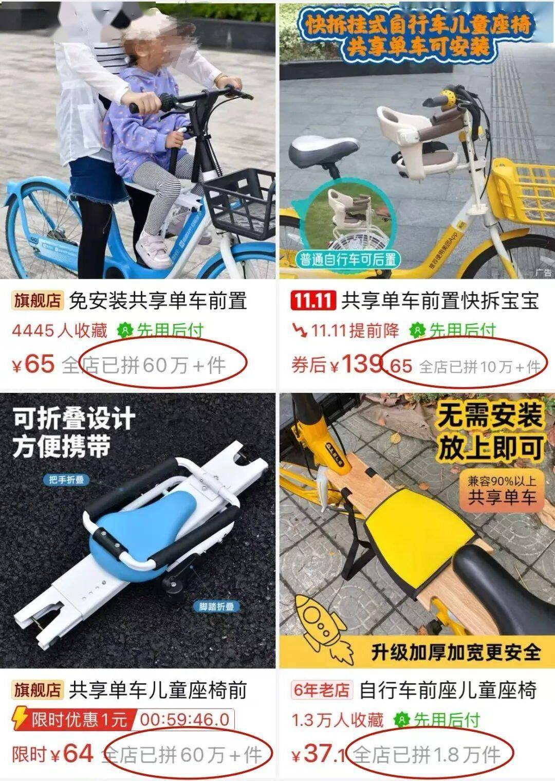 这种叫“共享单车儿童座椅”的产品,在电商平台上狂销几十万件,商家打着“便携免安装、一放即用”的招牌,宣称可以轻松带娃骑共享单车。价格从十几元到上百元不等。