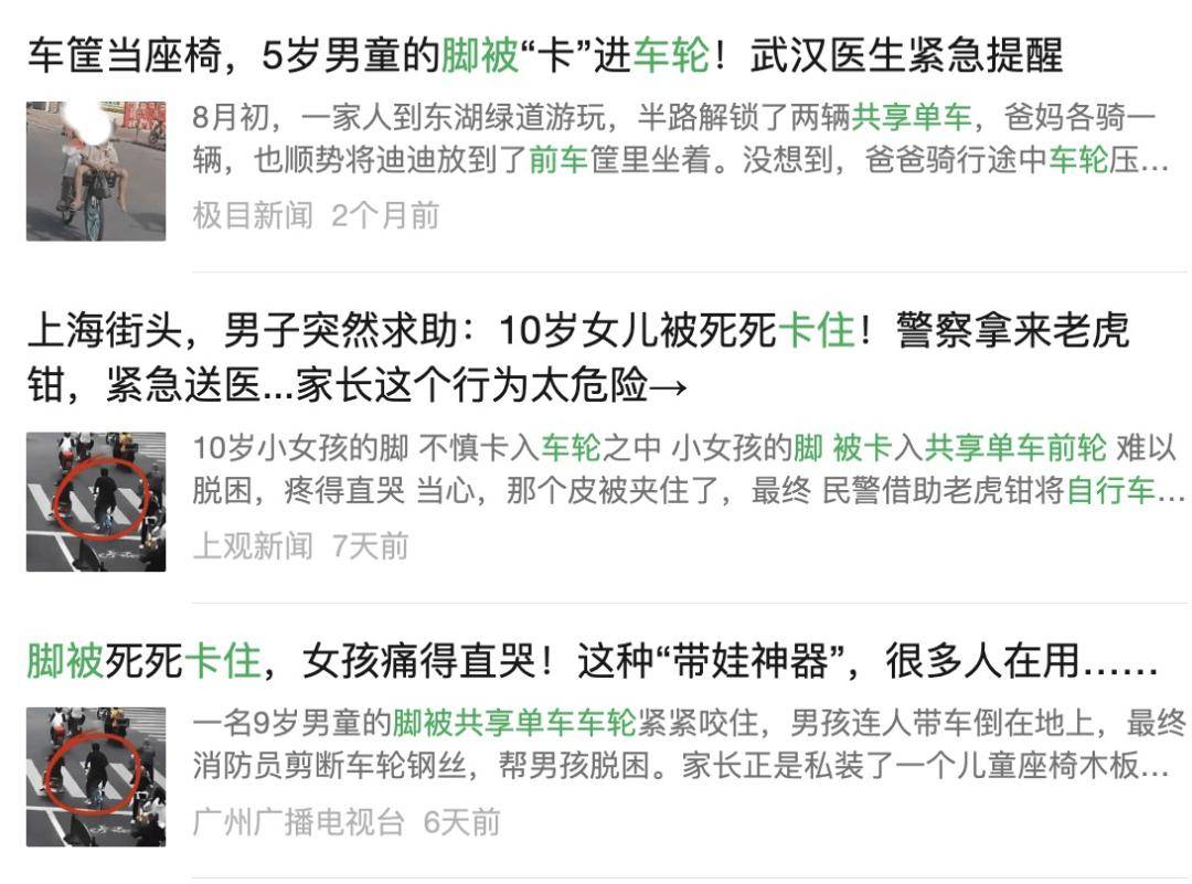 今年5月,北京市东城区就接连发生两起小孩儿脚被卡到共享单车前车轮的事故。当时孩子被吓的哇哇直哭,而导致孩子被卡的原因是家长图方便,在车上私装了共享单车带娃神器,车转弯的时候,孩子的脚就卡进去了,消防人员经过破拆将其救出。