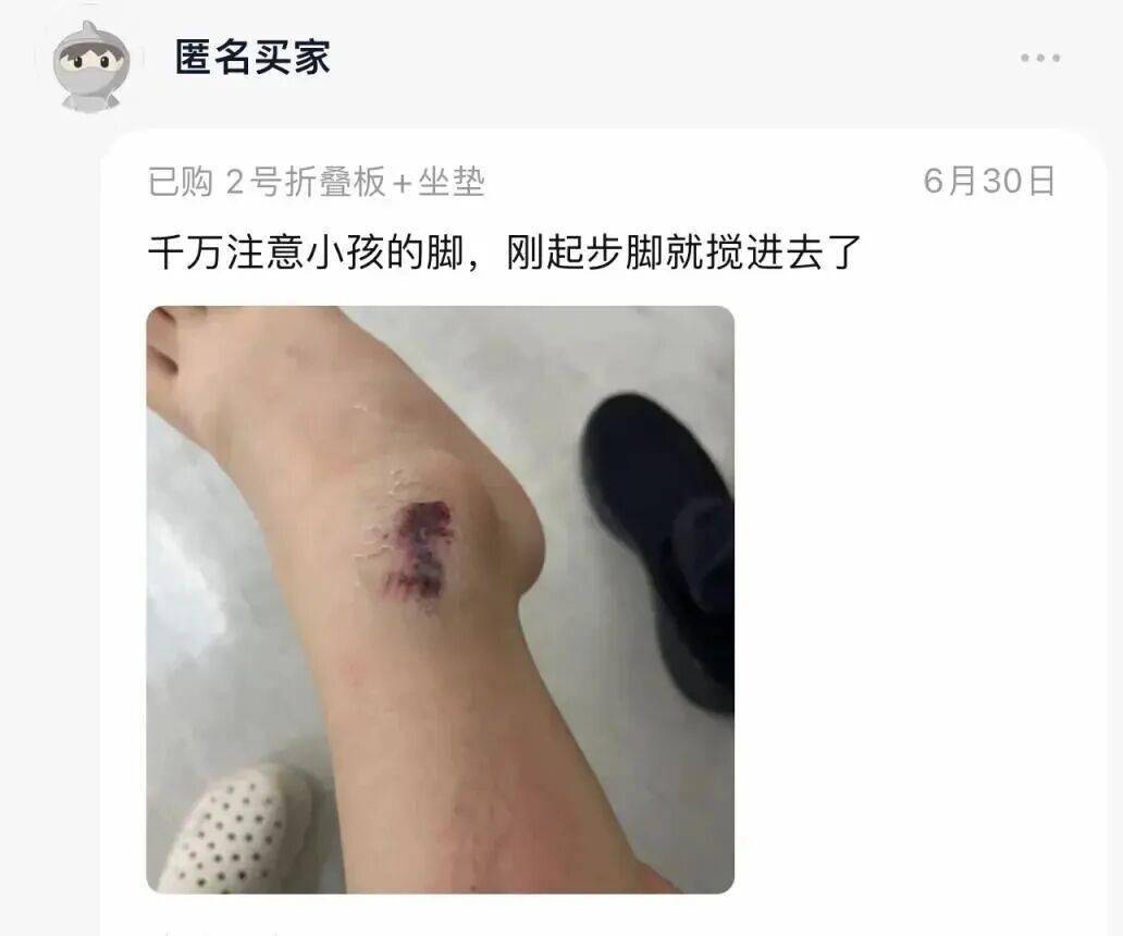还有网友晒出自己孩子的脚被磨破皮肤的照片并提示道,“千万注意小孩的脚,刚起步脚就绞进去了。”