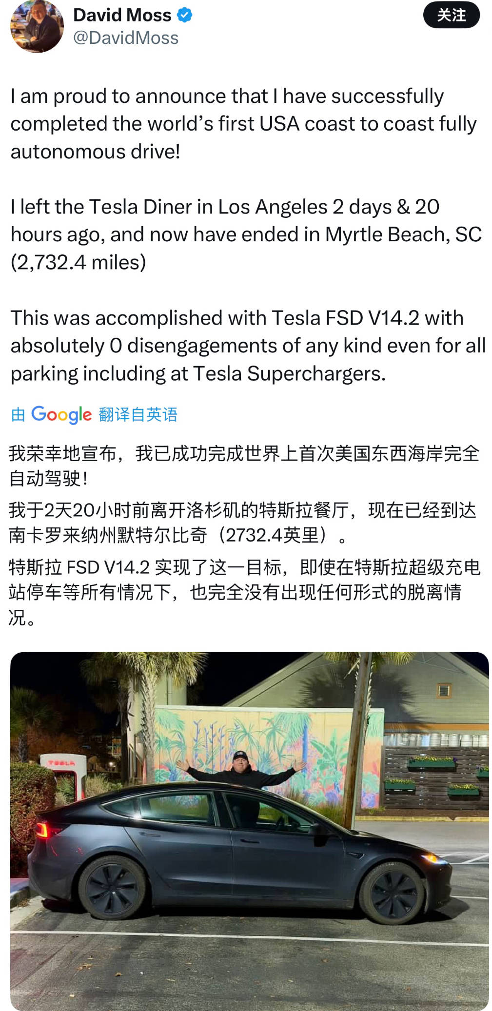 更有里程碑意义的事情是,2025年12月31日,一位特斯拉车主使用特斯拉FSD V14,完成了全程零接管横穿美国的壮举。途中在充电站的停车环节,也全部由特斯拉车辆自主完成。这是一次由普通客户完成的对量产车和V14版本软件的真实测试,标志着特斯拉自动驾驶真正意义上具备了完全自动驾驶的能力。此次横跨美国的旅程历时2天20小时、4400公里,大约相当于从上海到新疆喀什的距离。这个距离如果由人类驾驶员完成,考虑到休息时间,大概需要6-7天。特斯拉智能辅助驾驶不仅比人类驾驶更安全,同时也让交通更为高效。
