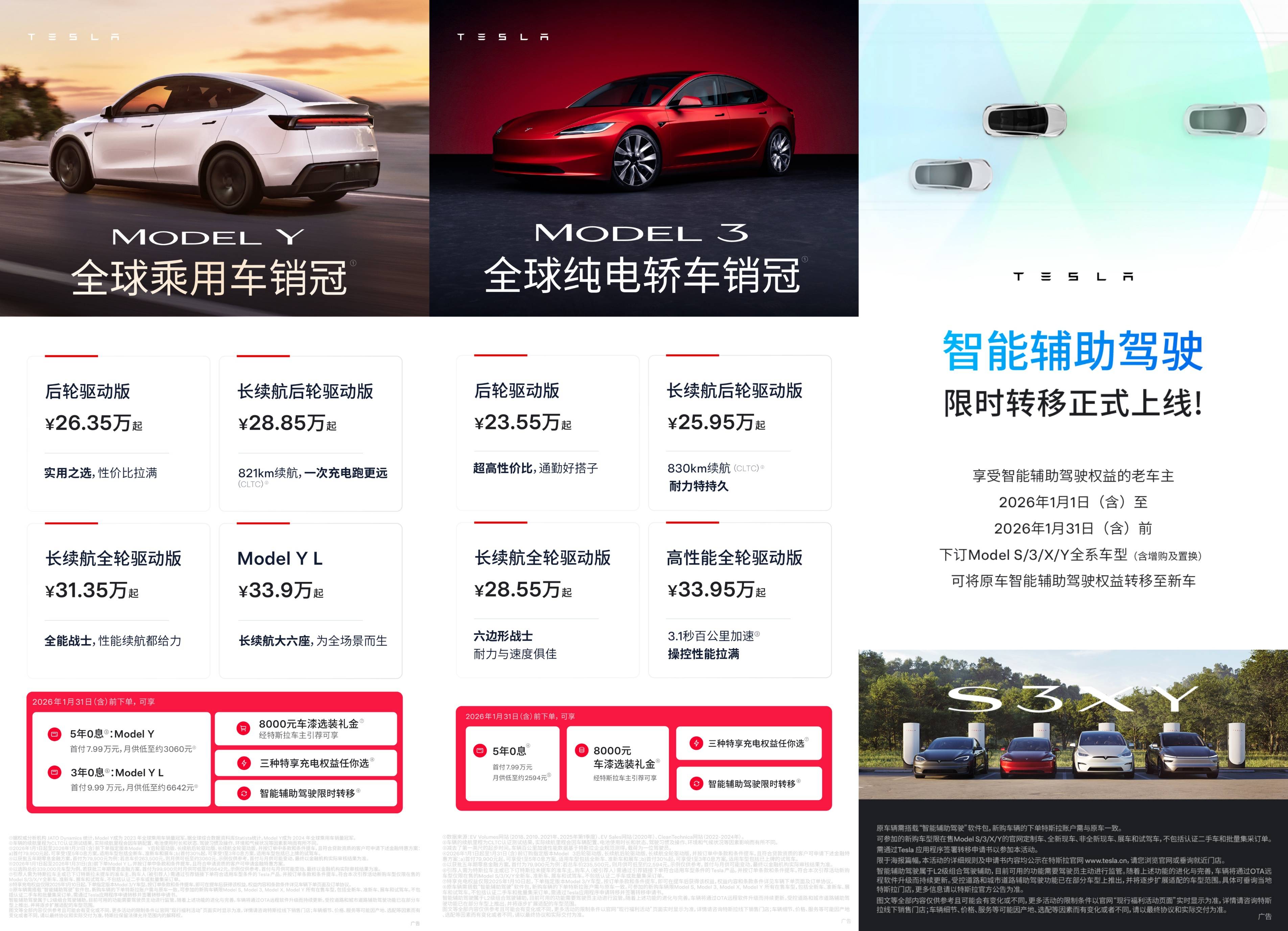 在不断提升产品力的同时,特斯拉也同步推出了多重购车政策:1月31日前下单Model 3/Y,可享“5年0息”、8000元车漆选装礼金、1299元特享充电权益,以及“智能辅助驾驶限时免费转移”等多重福利,进一步丰富用户选择。