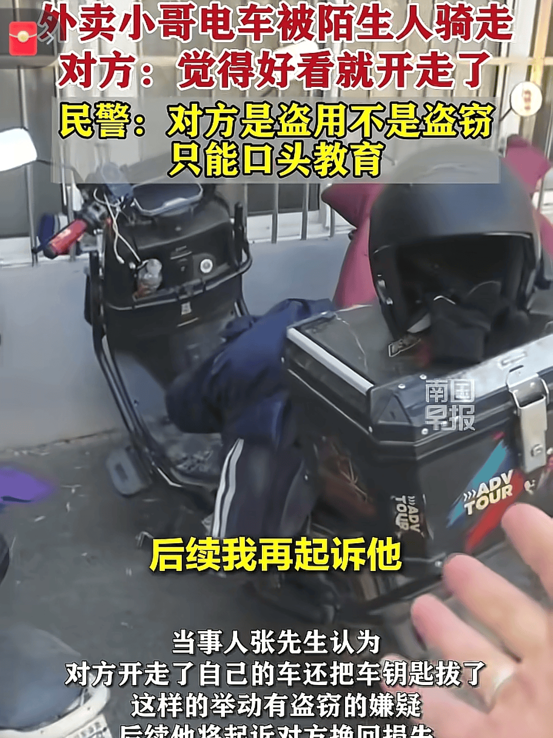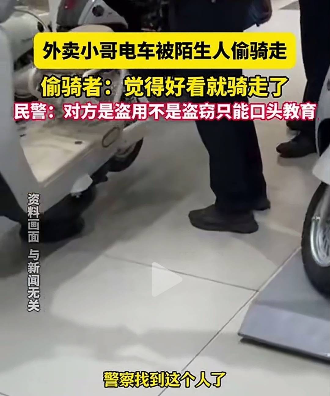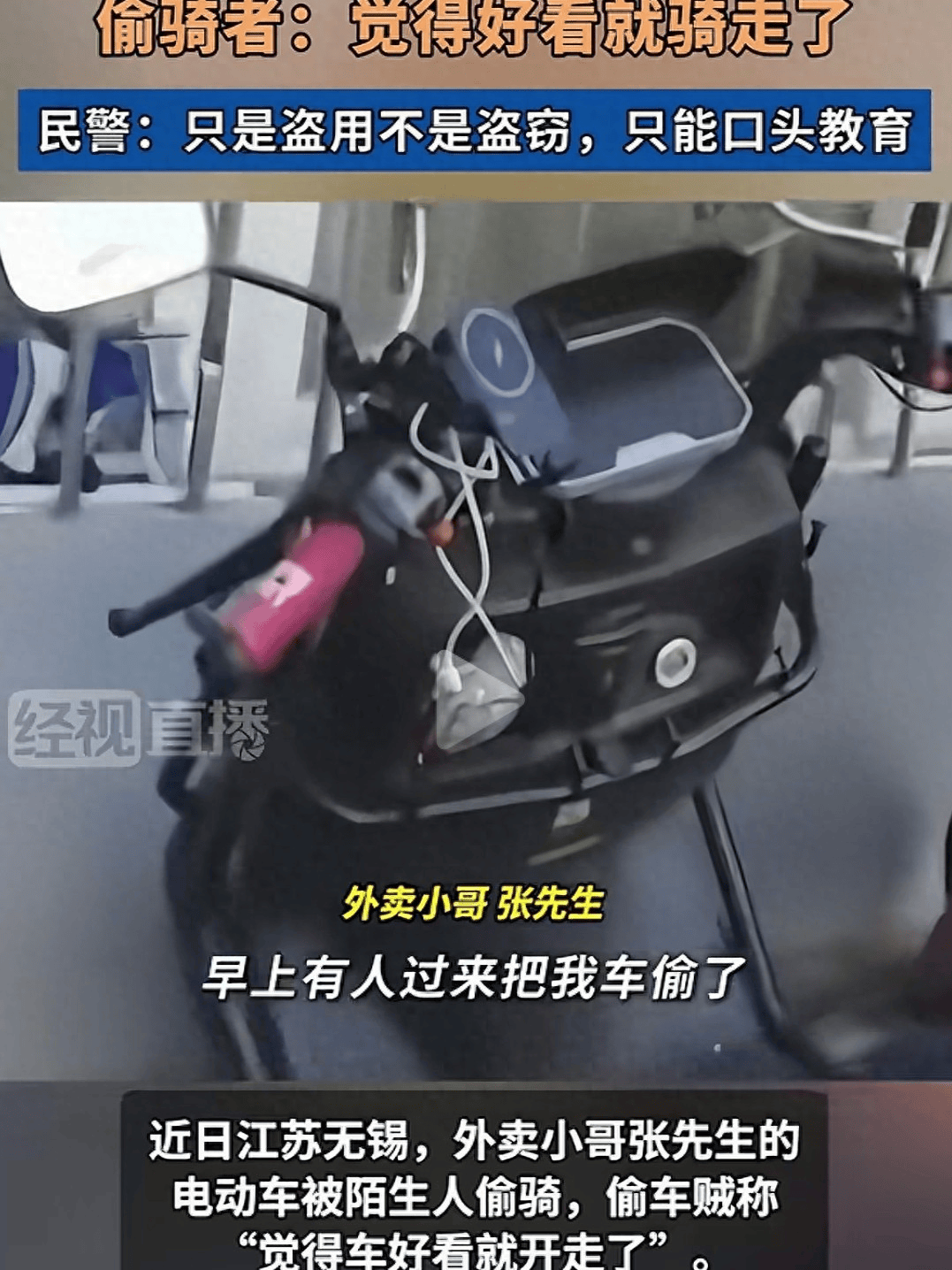 耽误了大半天,订单超时被罚,车子也没法正常使用,张先生又气又急,立刻报了警。警方通过监控排查,很快锁定了骑走电动车的男子。可让人没想到的是,面对民警的询问,该男子竟然一脸无辜地表示:“我没偷车啊,就是觉得他这外卖车挺好看的,想骑着兜一圈,根本没打算占为己有。”