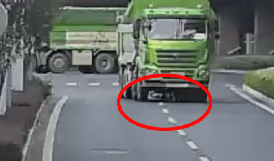 一辆电动自行车紧贴大货车右侧行驶,进入货车的视觉盲区,瞬间被卷入车底。所幸货车司机及时刹停,电动自行车驾驶人规范佩戴头盔,无生命危险,但面部挫伤、手部骨折。